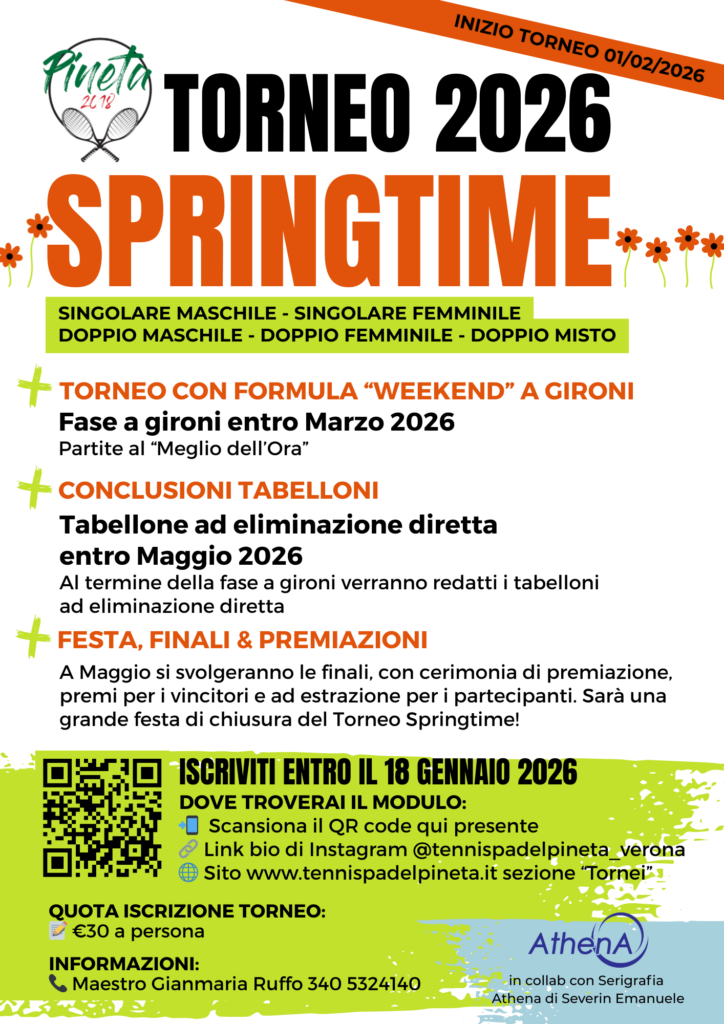 • TORNEO SPRINGTIME – dal 7 Gennaio 2026: Singolare maschile – singolare femminile – doppio maschile – doppio femminile – doppio misto (Maestro Gianmaria Ruffo). Iscriviti entro il 18 Gennaio 2026 👉​COMPILA IL MODULO per maggiori informazioni trovi tutto nella  👉​​​SEZIONE “TORNEI”