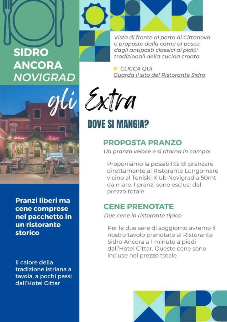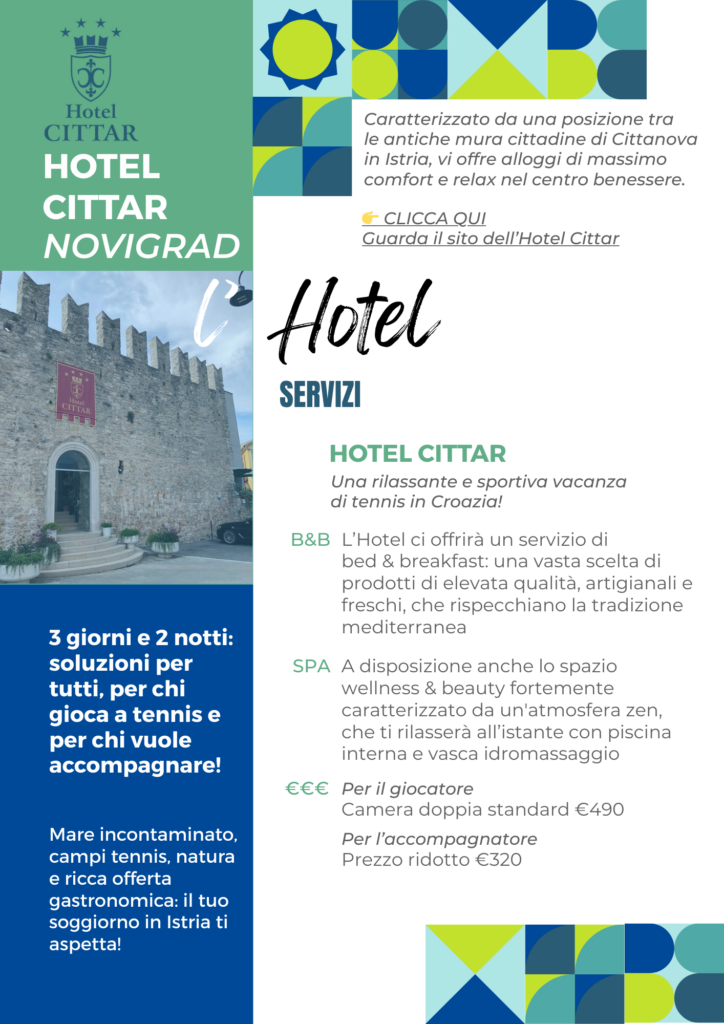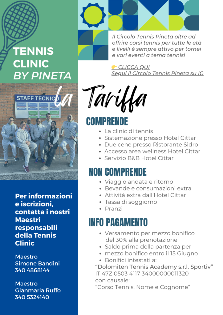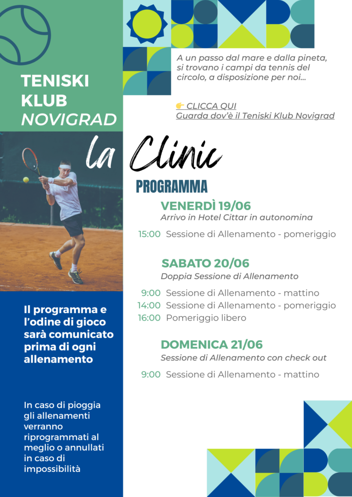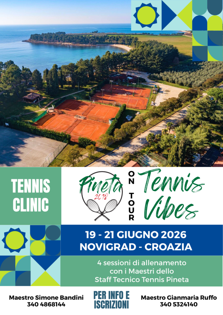 - TENNIS CLINIC BY TENNIS PINETA ON TOUR: dal 19 al 21 Giugno 2026, segna questa data e prenota il tuo weekend a Novigrad in Croazia. Ti aspetteranno 4 sessioni di allenamento con i Maestri dello Staff Tecnico Tennis Pineta, ovviamente con vista mare! Servizio di hotel B&B e cene prenotate in un ristorante tipico del posto. Maestri di riferimento: Maestro Simone Bandini 3404868144 e Maestro Gianmaria Ruffo 3405324140