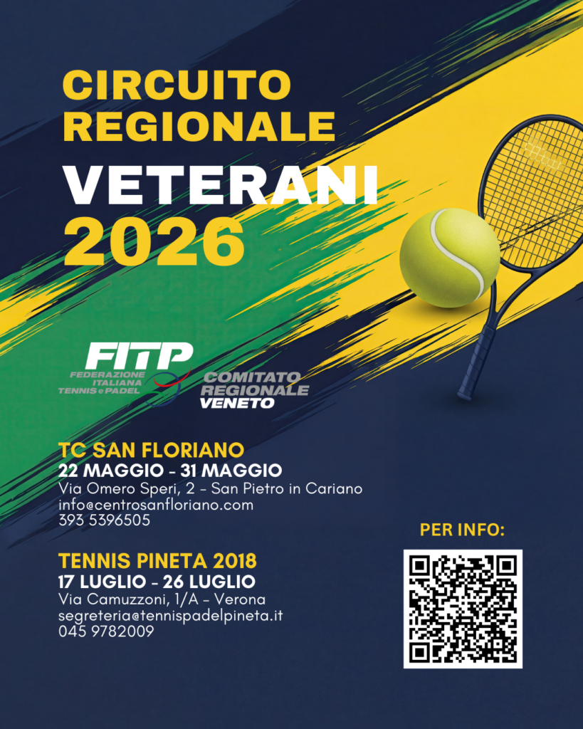 - CIRCUITO REGIONALE VETERANI FITP: circuito tennis a tappe in tutta la regione Veneto. Due tappe saranno disputate nei nostri campi: prima al TC San Floriano dal 22 al 31 Maggio, poi al Tennis Pineta dal 17 al 26 Luglio